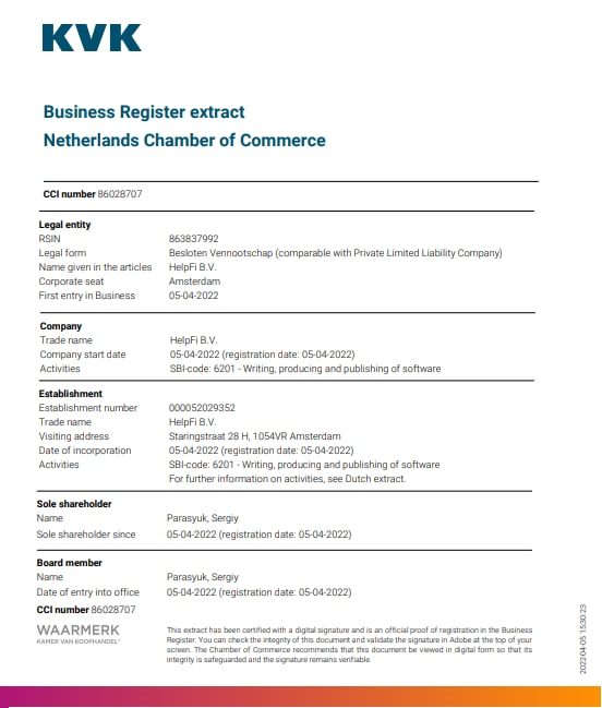 Ми вже маємо додатки на Android, iPhone, створили сайт та Call-центр, збудували базу з виконавців, які готові приймати замовлення! Ми зареєстрували торгову марку та програмний код, а також пройшли реєстрацію компанії HelpFi в Нідерландах.