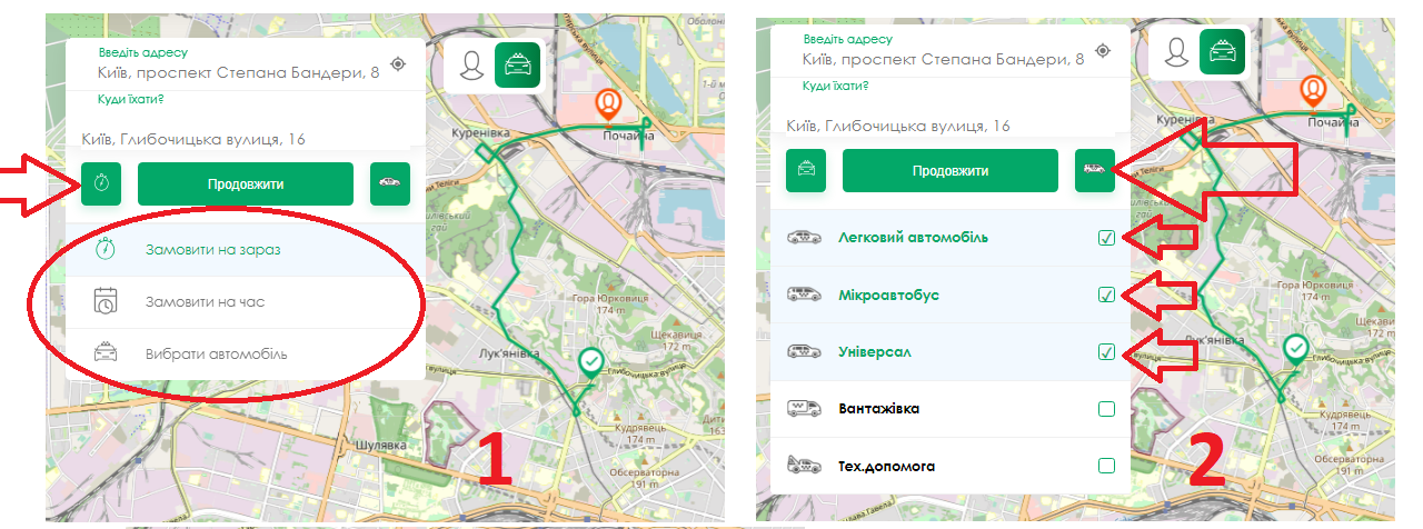 Щоб замовити таксі, вам потрібно натиснути на значок автомобіля у верхній частині сторінки.